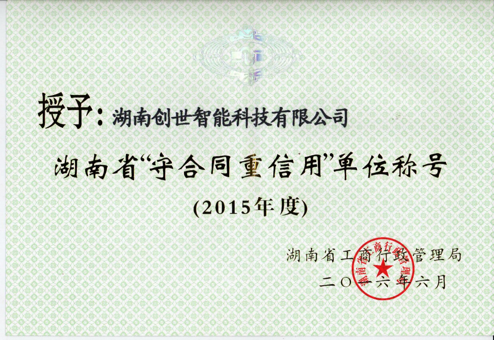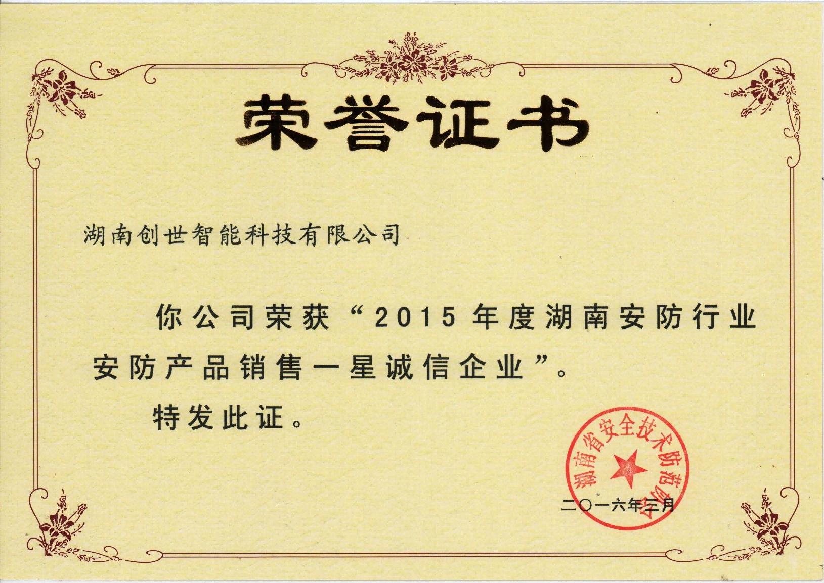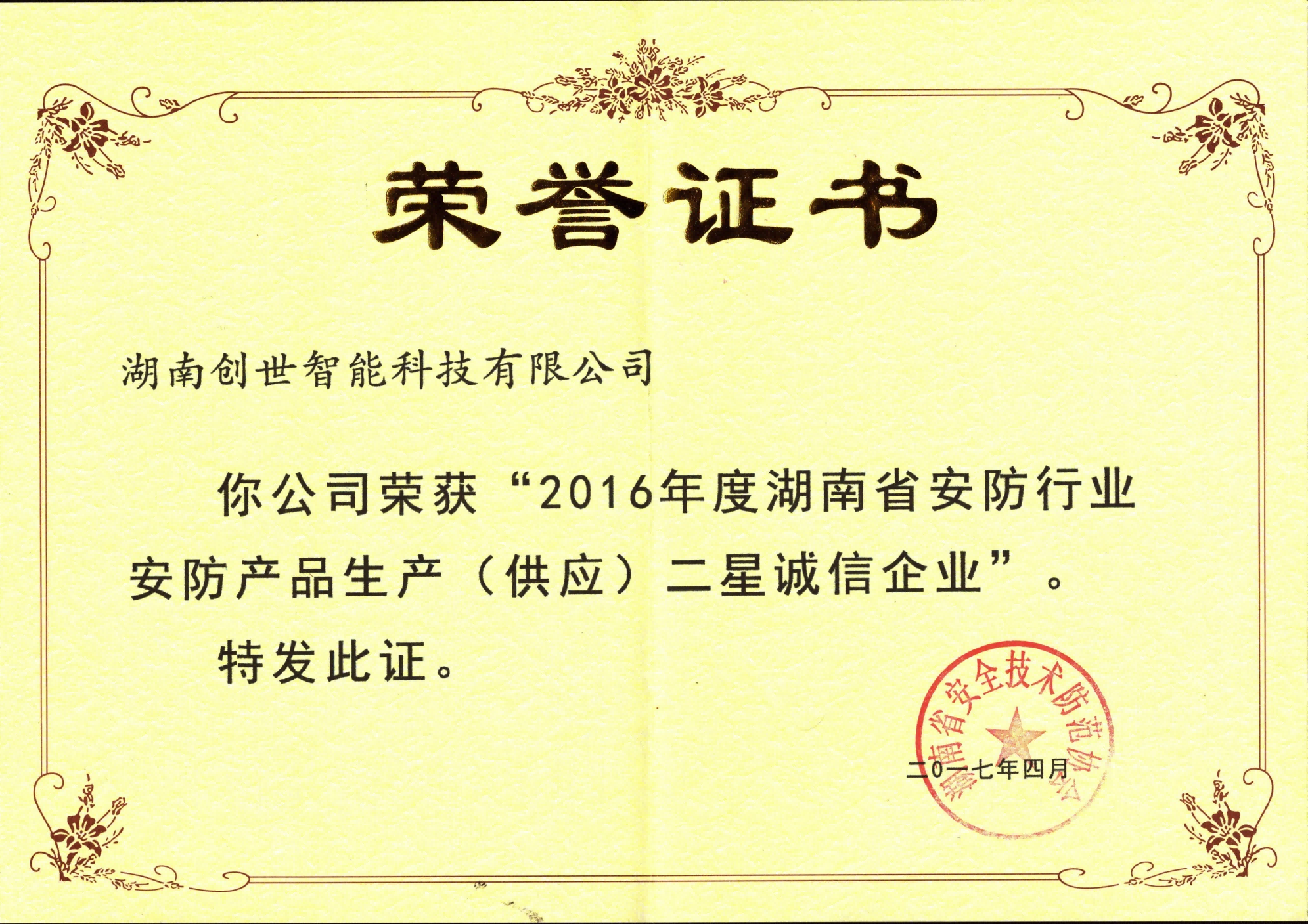 湖南省安防行业安防产品生产、销售诚信企业证书