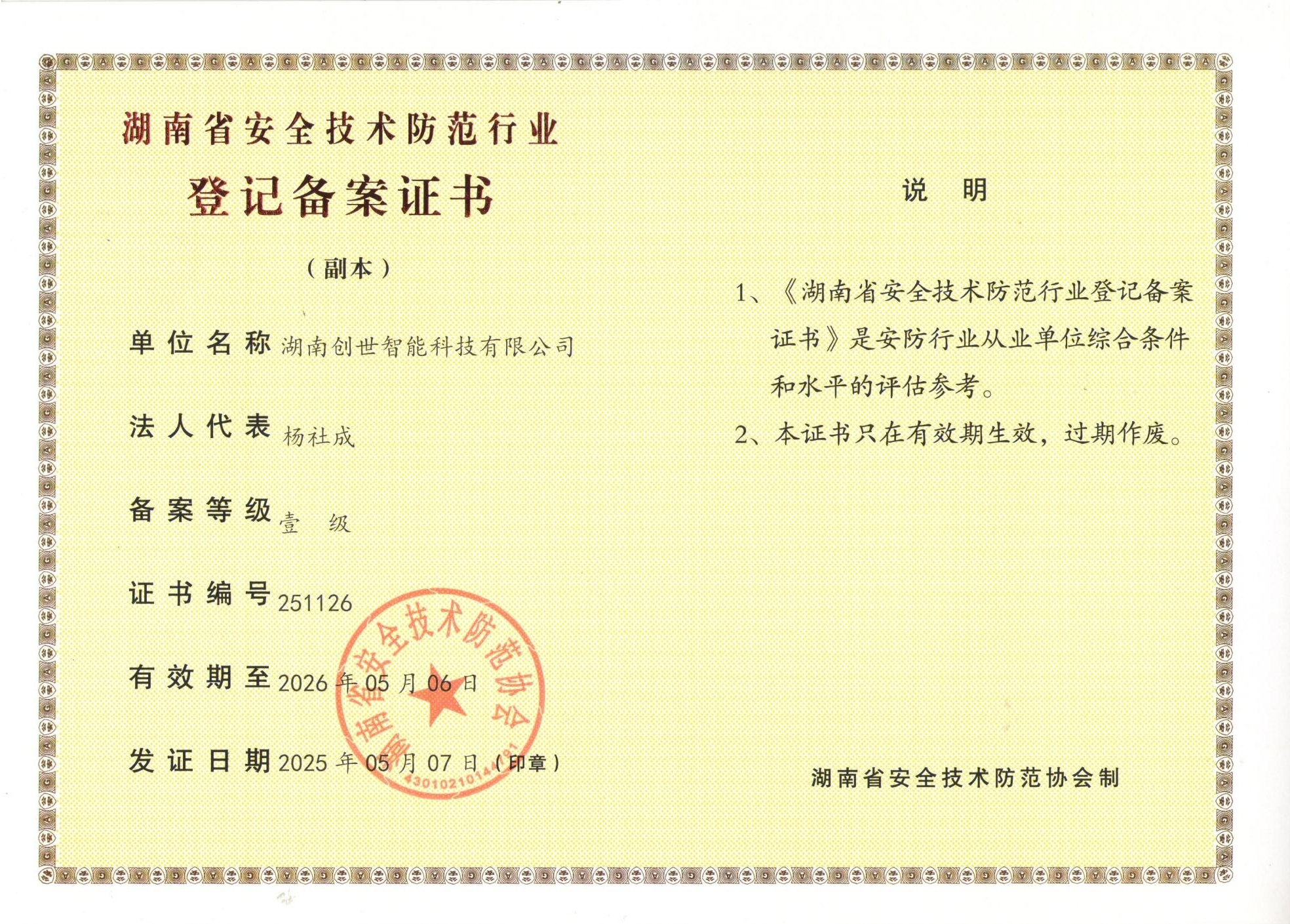 湖南省安全技术防范行业登记备案证